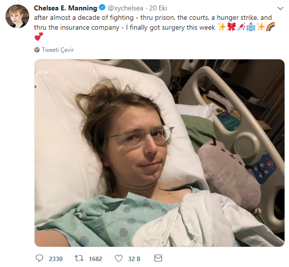 Pink news'in haberine göre, İki gün önce (20 Ekim) uyumlama operasyonundan hemen sonra yatağından fotoğraf paylaşan Manning şu mesajı yayınladı:“Neredeyse 10 yıllık bir mücadele, -hapishane, açlık grevi, sigorta şirketi- nihayet bu hafta ameliyat oldum!”