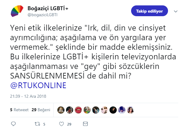 BÜLGBTİ+ Twitter hesabında RTÜK’ün etiketleyerek şöyle sordu: “Yeni etik ilkelerinize ‘Irk, dil, din ve cinsiyet ayrımcılığına; aşağılama ve ön yargılara yer vermemek’ şeklinde bir madde eklemişsiniz. Bu ilkelerinize LGBTİ+ kişilerin televizyonlarda aşağılanmaması ve ‘gey’ gibi sözcüklerin SANSÜRLENMEMESİ de dahil mi?”