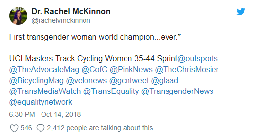 Canadian Cycling Magazine’in Haberine göre; 14 Kasım günü Los Angeles’da düzenlenen 2018 UCI Uluslararası Bisiklet Şampiyonasında, 35-39 yaş arası kadınlar sprinti dalında trans sporcu Rachel McKinnon müsabakaların tarihinde şampiyon olan ilk trans sporcu oldu. McKinnon galibiyetini “ilk trans şampiyon” gönderisi ile twitterdan kutladı.