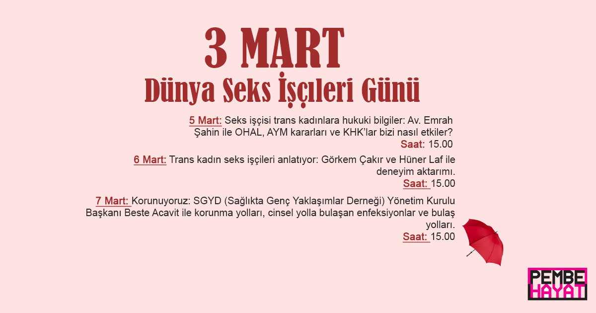 Hashtag kampanyasına 2018 3 Mart etkinlikleri afişini paylaşarak destek veren Pembe Hayat ise, 3 Mart canlı yayın etkinliklerini paylaşarak Ankara’daki LGBTİ+ etkinlikleri yasağına rağmen 3 Mart Dünya Seks İşçileri Günü’nde alternatif etkinlikler ördüğünü hatırlattı. Hazırlanan 3 günlük programda, her gün farklı bir konuk ve kurumu davet eden dernek, canlı yayın üzerinden etkinlikler yapmıştı.