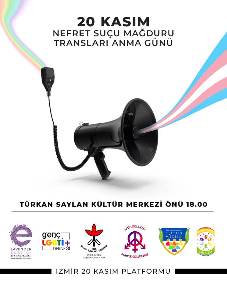 Türkiye’nin pek çok şehrinde nefret karşıtları 20 Kasım kapsamında bir araya gelmeyi hedefliyor. İçerisinde İzmir yerelinde faaliyet gösteren pek çok oluşumun bulunduğu 20 Kasım Platformu, 20 Kasım’da “Trans hakları insan haklarıdır” demek için bir olmaya çağırıyor.