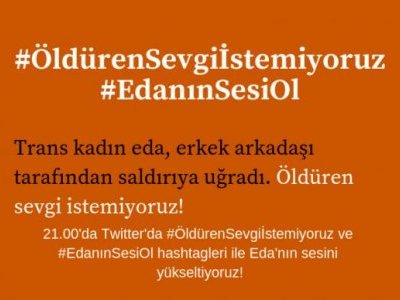 Eda Dayanışmaya Çağırıyor: #ÖldürenSevgiİstemiyoruz Dün gece saatlerinde erkek arkadaşı tarafından ayrılmak istediği için saldırıya uğrayan ve çenesi kırılan trans kadın Eda için bugün (24 Ağustos) 21.00'da Twitter'da buluşuyoruz: #ÖldürenSevgiİstemiyoruz !
